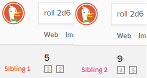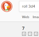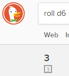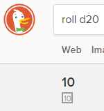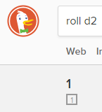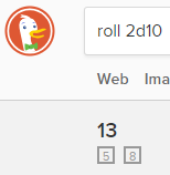 Oh dear, it seems like the DuckDuckGo search engine’s otherwise useful dice roller can’t handle a d100! I suppose I’ll be rolling a d10 twice. Note that in the following image and all future d100 rolls I’m taking the two results (the numbers in squares) rather than the numeric total in bold.