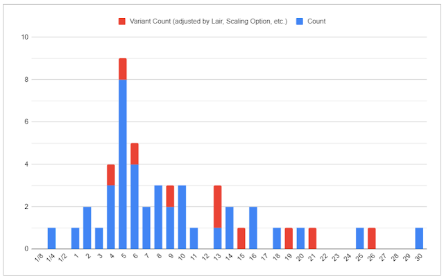 I also want to take a look at the CR distribution of IA‘s adversaries. In the chart below, blue reflects the base CR of all 40 adversaries. Red reflects alternative CRs offered for any reason: be it a CR that applies when a circumstance changes (eg. when Nocri Dragonwing lays her egg), when scaled down variants are provided (eg. The Jabberkoth), or when the adversary is presented in one or more encounter configurations which are measured by CR (eg. Kranklob’Obgund).