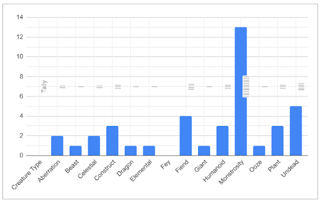 First, let’s look at the distribution of creature types in this book: