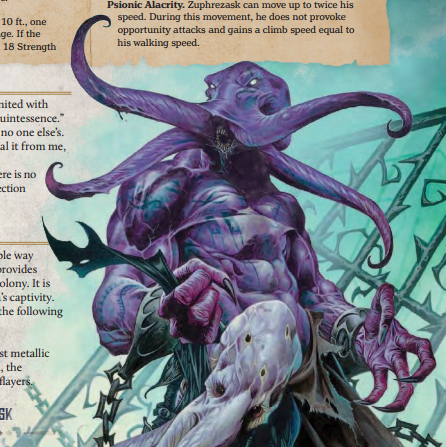 39. Zuphrezask (CR 14 Aberration) is a unique mind flayer. Traditionally, the illithids can only create more of their kind by transplant one of their tadpoles into the brain of a humanoid creature. Clearly a group of illithid have been experimenting, as they’ve created a unique mind flayer ogre. Zuprezask leads a heretic cult of Thoon and attacks other illithids. It might seem wise to just leave him to it, but surviving mind flayers and their servants are dispersing out through the underdark, creating a ripple effect of disruption and displacement that even reaches the surface. Plus, he believes by consuming “quintessence” from brains he can become a god: what happens when he runs out of mind flayers and moves on to other peoples? And what happens if he’s right?