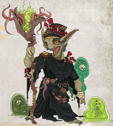 24. Madcap Mraz (CR 6 Humanoid) is a goblin who accidentally consumed fungi that had absorbed nutrients from an ooze. He began seeing visions from Ghaunadaur, god of mad abominations. He now leads a monstrous army to spread ruin and madness in his master’s name! Mraz combines the features of a goblin and a cleric, and he is equipped with a magical staff that shares the property of a gray ooze to dissolve armour. If encountered in his mushroom-overgrown throne room he has oozes and goblins at his command, and has lair actions to cause mushrooms to explode in a cloud of blinding spores, as well summon goblin fanatics (a statblock is provided for this creature).