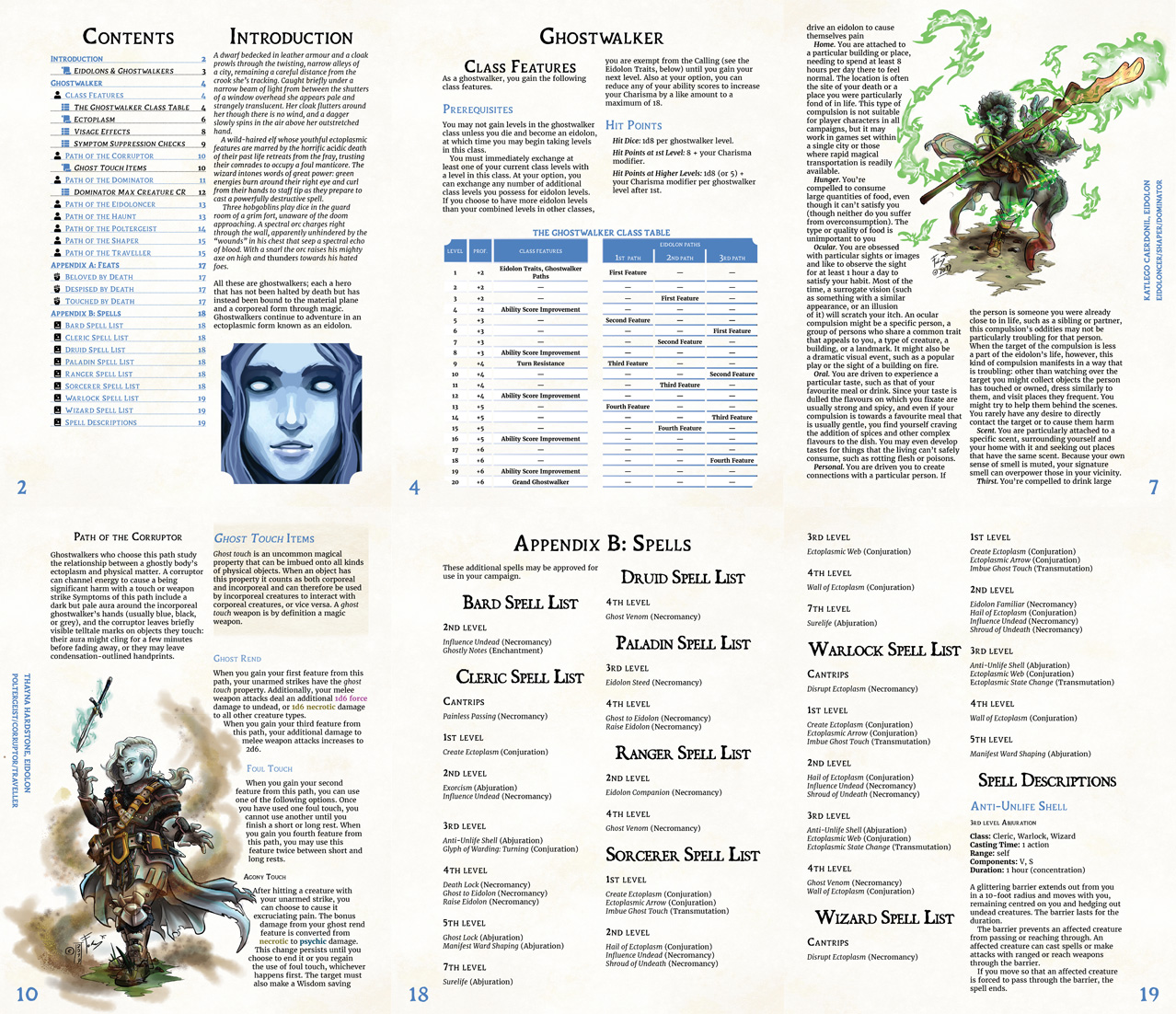 Ghostwalker: Eidolon revisits the concept of Eidolons, or corporeal ghosts, which first appeared in the D&D 3.5 campaign setting Ghostwalk. Ghostwalker: Eidolon converts the Eidolon and Eidoloncer classes to D&D 5e without relying on the lore of the Ghostwalk setting. Strictly setting neutral, you can use this product to create the Forgotten Realms, Greyhawk, Ravnica, Eberron, or other setting of your choice. Furthermore, Ghostwalker: Eidolon introduces the concept of soul anchors, portable items that have the power to bind a soul to the material plane and allow the recently deceased to manifest corporeally. Unlike a manifest ward which has a similar effect in a limited geographical region, soul anchors can be carried with the eidolon and allow it to continue taking part in adventures!